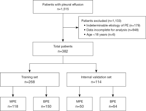The patient selection flow chart of this study is shown in Figure 1. A total of 382 participants (168 MPE and 214 BPE) were included in this study. In total, 70% (n=268) were randomly assigned to the training set while the remaining participants (n=114) were assigned to the internal validation set. The demographic and clinical characteristics of the subjects are shown in Table 1. The specific causes of 382 patients are shown in Table 2.