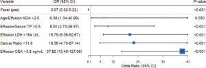 ADA, adenosine deaminase; CEA, carcinoembryonic antigen; CI, confidence interval; CR, cancer ratio (serum LDH/pleural ADA ratio); LASSO, least absolute shrinkage and selection operator; LDH, lactate dehydrogenase; OR, odds ratio; TP, total protein.