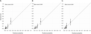 The calibration curves (Figure 1) for the three models exhibited alignment between predicted and observed positive cases (children with PAL). Furthermore, these three models attained low Brier scores, signifying the high accuracy of their probabilistic forecasts. DCA for the three models revealed that they could achieve a high net benefit, suggesting desirable clinical value (Figure S1). Overall, three prediction models based on different algorithms demonstrated a similar performance.