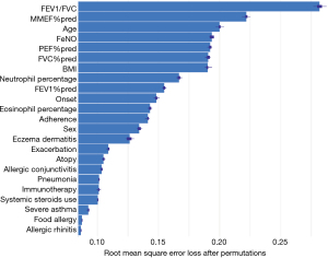 We collected a variety of predictors primarily from the electronic medical records of the study participants. These predictors included (I) demographic data: age, gender, and body mass index (BMI); (II) clinical characteristics: asthma severity, history of asthma exacerbation and pneumonia, atopy status, and allergic comorbidities; (III) laboratory tests: blood neutrophils and eosinophils, total serum immunoglobulin E (IgE) level, specific IgE values, skin prick test, fraction of exhaled nitric oxide (FeNO); (IV) baseline spirometry measurements (performed at the enrollment): forced expiratory volume in 1 second (FEV1)/forced vital capacity (FVC), percentage of predicted FEV1 (FEV1%pred), percentage of predicted FVC (FVC%pred), percentage of predicted peak expiratory flow (PEF%pred), and percentage of predicted maximal mid-expiratory flow (MMEF%pred); and (V) asthma medication use: daily dose of inhaled corticosteroids (ICS), systemic steroid use, medication adherence, and immunotherapy.