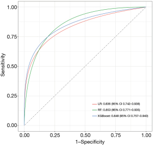 AUC, area under the curve; CI, confidence interval; LR, logistic regression; RF, random forest; XGBoost, extreme gradient boost.