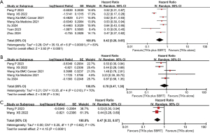 To further support our findings, we conducted a meta-analysis by integrating our data with six unique studies (Figure 3), which collectively comprised 715 patients diagnosed with EGFR-mutated NSCLC. Among them, 456 patients received TKI monotherapy, while 259 patients underwent combination treatment with TKI and SBRT. Table 4 presents relevant information about each study (22-25,33,34). First, pooled analyses for PFS and OS were performed on all patients. The HR for PFS in the group receiving combined SBRT treatment was 0.42 (95% CI: 0.28–0.65, P<0.001) (Figure 4A). Due to the high heterogeneity of this subset of results (I2=83%), we conducted a leave-one-out sensitivity analysis to assess the robustness of our findings. The results indicated that the combined effect remained stable regardless of which study was excluded (Table S1). The HR for OS in the combined SBRT group was 0.78 (95% CI: 0.47–1.3, P=0.34), suggesting no significant OS benefit (Figure 4B). While the analysis was restricted to two prospective studies, the HR for OS in the combined SBRT group was 0.47 (95% CI: 0.33–0.67, P<0.001) (Figure 4C). These results align with our retrospective study, indicating a benefit in both PFS and OS with combined SBRT, with lower heterogeneity compared to the inclusion of retrospective analyses (I2 values were 0%). However, it is important to note that both of these prospective studies included SBRT to both primary and metastatic lesions. Therefore, the specific clinical benefit of SBRT to the primary tumor in patients with disease stabilization after EGFR-TKI therapy remains to be further validated in large-scale prospective clinical trials.
