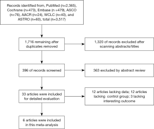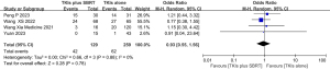 A systematic literature review was conducted on PubMed, Cochrane, Embase and other online databases up until January 10, 2025, for randomized clinical trials (RCTs) using the following search terms: (((“Stereotactic body radiation therapy” OR “radiosurgical” OR “gamma knife radiosurgery” OR “cyberknife radiosurgery” OR “Stereotactic radiosurgery” OR “Radiosurgery” OR SBRT) AND “non-small cell lung cancer” OR “NSCLC”)) AND “EGFR tyrosine kinase inhibitor” OR ((EGFR-TKI) OR (Epidermal Growth Factor Receptor tyrosine kinase inhibitor)) AND (“randomized controlled trial” OR “RCT” OR “clinical trial”), with an English language restriction. To ensure the comprehensiveness of the included literature, we also searched relevant abstracts from the American Society of Clinical Oncology (ASCO), American Association for Cancer Research (AACR), World Conference on Lung Cancer (WCLC), and American Society for Radiation Oncology (ASTRO) conferences over the past 10 years. Studies were included based on the following criteria: (I) histologically confirmed NSCLC with EGFR mutation; (II) metastatic or stage IV disease; (III) direct comparison of TKIs combined with SBRT versus TKIs alone; (IV) sufficient data for quantitative meta-analysis [reporting at least one outcome measure (PFS or OS or ≥ grade 3 treatment-related AEs) in terms of odds ratio (OR) or hazard ratio (HR)]. Review Manager 5.4 was used for statistical analysis.