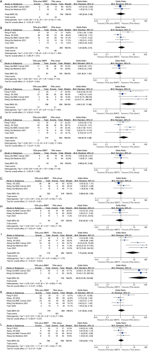 Two prospective studies and one retrospective study described the grades of AEs. The pooled analysis showed no increased incidence of grade ≥3 AEs in patients who had SBRT (Figure 5). Figure 6 shows the analysis of AEs of all grades (Figure 6A-6L). Although the TKIs plus SBRT group had a higher probability of developing esophagitis (Figure 6D), pneumonitis (Figure 6I), and radiation dermatitis (Figure 6J) compared to the TKIs alone group, all of these events were low grade (grade 1–2), indicating that the addition of SBRT was generally well tolerated. These findings are consistent with the toxicity profile observed in our retrospective cohort.