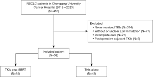 This single-center retrospective research was approved by the Chongqing University Cancer Hospital Ethics Committee. Between 2018 and 2023, we screened 485 patients who were pathologically diagnosed with NSCLC and received targeted therapy at Chongqing University Cancer Hospital. Inclusion criteria consisted of (I) pathological diagnosis of stage III or metastatic/recurrent NSCLC according to the 8th edition of the American Joint Committee on Cancer (AJCC) staging manual (26); (II) molecular testing indicating activating EGFR mutations; (III) age 18 years or older; (IV) patients received first-line EGFR-TKI therapy combined with SBRT for the primary tumor before disease progression, or received first-line EGFR-TKI alone without disease progression at the time of the first imaging assessment. In the TKIs plus SBRT group, radiotherapy was administered as part of routine clinical care after patients showed initial tumor shrinkage with EGFR-TKI therapy and achieved stable disease, with persistent residual lesions at the primary site and no evidence of new metastases on serial imaging. The main exclusion criteria included early-stage NSCLC, tumor progression before SBRT, or confirmed disease progression at the first imaging assessment in the TKIs alone group.