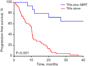 The median follow-up duration was 37.5 months in the SBRT plus TKIs group and 29.3 months in the TKIs alone group. The disease progression was observed in 6 patients in the TKIs plus SBRT group, and all patients in the TKIs alone group experienced disease progression. Compared with the TKIs alone group, the TKIs plus SBRT group showed a significantly longer median progression-free survival (mPFS) [54.9 vs. 10.2 months, HR =0.21, 95% confidence interval (CI): 0.12–0.39, P<0.001, Figure 2]. One patient in the TKIs plus SBRT group died, and the median OS had not yet been reached. In contrast, 20 patients in the TKIs alone group died, with a median OS of 40.5 months (95% CI: 24.4–56.7). In univariate Cox regression analysis, an ECOG score <2 (HR =0.37, 95% CI: 0.17–0.78, P=0.009), the use of SBRT (HR =0.12, 95% CI: 0.05–0.31, P<0.001) and EGFR-TKIs type (HR =0.08, 95% CI: 0.01–0.61, P=0.02) were predictors of longer PFS (Table 2). Further multivariate Cox regression analysis identified SBRT as an independent predictor of prolonged PFS (HR =0.15, 95% CI: 0.05–0.45, P<0.001) (Table 2).