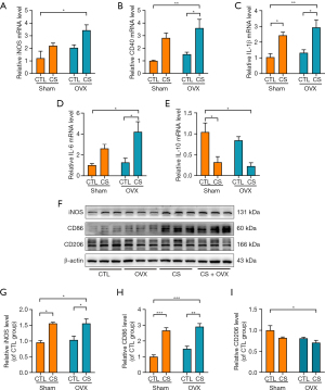 Given the primary association of ventral hippocampus with depressive behaviors, we focused our investigation on this specific region. To further elucidate the phenotype of microglial activation in COPD rats, we examined whether OVX and/or CS exposure could influence M1/M2 microglia polarization. We observed that the mRNA levels of iNOS and CD40 were elevated in the CS + OVX group within the rat hippocampus (Figure 4A,4B). The mRNA expression of pro-inflammatory cytokines, including interleukin-1 beta (IL-1β) and interleukin-6 (IL-6), was significantly elevated, whereas the expression of the anti-inflammatory cytokine interleukin-10 (IL-10) was significantly reduced (Figure 4C-4E). Additionally, the expression of iNOS and CD86 (M1 markers) were significantly increased, and CD206 (M2 markers) was decreased in the hippocampi of CS + OVX rats (Figure 4F-4I). Overall, our findings indicate that chronic smoke exposure in OVX rats promotes neuroinflammation and the M1 polarization of microglia.