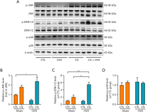 The protein expression levels of p-JNK and p-ERK1/2 in the hippocampus of rats increased significantly following exposure to CS (Figure 5). Moreover, the expression levels of p-JNK and p-ERK1/2 in the hippocampus of rats in the CS + OVX group showed an even more pronounced increase.