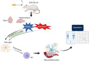 CS can induce neuroinflammation in rats, leading to depression-like behavior, which is associated with the activation of microglia and M1 polarization via the ERK1/2 and JNK pathways. The decreased E2 levels resulting from OVX exacerbated the neuroinflammation and depression-like behavior induced by CS. E2 plays a crucial role in maintaining microglial stability and mitigating neuroinflammation during the onset and progression of depression in COPD. Therefore, controlling neuroinflammation, maintaining stable E2 levels in the body, and inhibiting the activation of microglia and M1 polarization may be essential strategies for reducing the incidence of depression in female patients with COPD. It should be noted that, it remains unclear whether the results of this study, especially the protective effect of E2 on neuroinflammation linked to depressive behaviour, can be extrapolated to women with COPD.