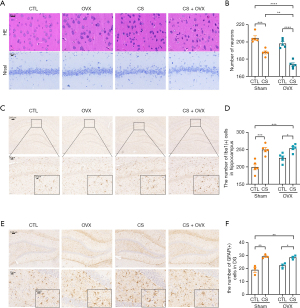 The hippocampus, which plays a central role in mood regulation and memory, has attracted considerable attention in depression research. As illustrated in Figure 2A, neurons in the cerebral cortex of CTL group were arranged neatly, with round or oval nuclei, uniform staining, and clear nucleoli. In contrast, abnormal morphological changes, such as vacuole-like formations and pyknotic changes in neurons, were observed in the hippocampal CA1 region of rats exposed to CS. Additionally, the boundary between the cytoplasm and nucleus was indistinct in the OVX group. In both the CS and CS + OVX groups, the arrangement of nerve cells was irregular, the cells in the CS group were loosely and irregularly arranged, with blurred boundaries and severe nuclear pyknosis. Notably, compared to the CTL group, there was a significant decrease in the number of neurons in the hippocampal CA1 region of the CS + OVX group (Figure 2B).
