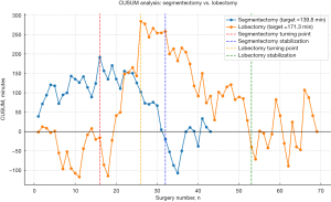 Interestingly, our CUSUM analysis demonstrated that segmentectomy reached a turning point earlier (16th case) than lobectomy (26th case), with mean operative times decreasing by 19.1 and 17.6 minutes, respectively, after these thresholds. Despite the greater technical complexity of anatomical segmentectomy, proficiency appeared to be achieved more rapidly. This may reflect the surgeon’s frequent exposure to segmentectomy at our institution and the use of cognitive preparation strategies such as video review and mental rehearsal. Notably, this earlier turning point highlights that proficiency in segmentectomy may be achievable with fewer cases than traditionally expected, particularly when supported by structured mentorship and frequent institutional exposure.