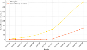 All statistical analyses were conducted using R software (R Foundation for Statistical Computing, Vienna, Austria). Categorical variables were compared using Fisher’s exact test or Pearson’s chi-squared test, and continuous variables were compared using the Wilcoxon rank-sum test. Data were expressed as means with ranges or counts with percentages, as appropriate. Subgroup comparisons between lobectomy and segmentectomy included age, sex distribution, operative time, anesthesia time, intraoperative blood loss, chest tube duration, hospital stay, postoperative recovery days, complication rates, and 30-day mortality. Trends in surgical volume, operative time, and blood loss were visualized quarterly using line and bar charts. A P<0.05 was considered statistically significant.