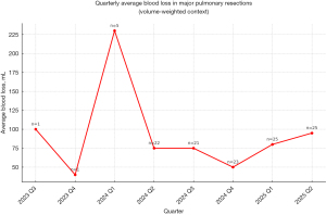 Operative performance improved significantly over time. The average operative time for major pulmonary resections decreased from 207.5 minutes in 2023 to 152.6 minutes in 2025. A parallel trend was observed for anesthesia duration, which declined from 241.0 to 163.5 minutes over the same period. These improvements were observed in the context of a steadily rising surgical volume and case complexity (Figures 1,2). Additionally, intraoperative blood loss progressively decreased, with the mean volume falling from over 200 mL in early cases to approximately 80 mL in later quarters (Figure 3).