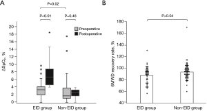 In the non‑EID group, preoperative ΔSpO2 [1.7% (IQR, 1.05–3.75)] did not differ significantly from postoperative ΔSpO2 [2.6% (IQR, 1.65–3.25); P=0.46]. In contrast, postoperative ΔSpO2 in the EID group [6.7% (IQR, 4.6–8.8)] was higher than that of preoperative ΔSpO2 [3.3% (IQR, 1.9–4.1); P<0.01]. Preoperative ΔSpO2 in the EID group was lower than that of the non-EID group (P=0.02) (Figure 2A). The postoperative 6MWD recovery rate was also lower in the EID group [88.1% (SD, 14.0)] than that in the non-EID group [94.1% (SD, 14.7); P=0.04] (Figure 2B).