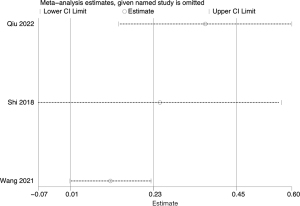 One-way sensitivity analysis showed that removal of the Shi [2018] study (25) rendered the difference in FEV1 non-significant (P>0.05), indicating that this study was the main contributor for unstable results. Therefore, it was impossible to conclude whether EA is more effective than other treatments for improving FEV1. Furthermore, exclusion of the Qiu [2022] (26) or Wang [2021] (22) study also removed the heterogeneity in FEV1 (I2=0%, P=0.39 or I2=0%, P=0.56), suggesting that the heterogeneity was predominantly attributed to these studies (Figure 5).