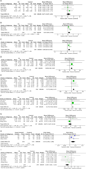 Change in CAT score was determined in seven studies with 491 patients (247 EA vs. 244 control) (15,16,19,25,26,29,30). Our data demonstrated that EA treatment led to markedly lower CAT score than control treatment (WMD: −2.39; 95% CI: −3.63, −1.15; P<0.001). Heterogeneity was absent across the studies (I2=0%; P=0.90) (Figure 3I), and a minor publication bias was present in the funnel plot (Figure 4I) but not in the Egger’s test (P=0.64).