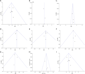Regarding forest plots of meta-analyses of different outcomes between the EA group and control group (Figure 3), change in BMI was reported in four RCTs with 219 patients (109 EA vs. 110 control) (20,21,29,30) and was not significantly different between the two groups (WMD: 0.27; 95% CI: −0.47, 1.01; P=0.47). No significant heterogeneity (I2=0%; P=0.90) was detected among the studies (Figure 3A). Regarding Funnel plots of different outcomes (Figure 4), a minor publication bias was detected in the funnel plot (Figure 4A) but not by the Egger’s test (P=0.29).