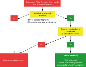 In the patient with anomalous origin of the RCA and associated interarterial pathway, the first step after establishing the diagnosis is to rule out the presence of inducible ischemia, since in these cases the general recommendations are to revascularize to reduce the symptoms and the risk of SD. In those patients in whom ischemia induction tests are negative, the second step is to adequately assess the interarterial pathway, in order to rule out obstructions or compressions that also justify revascularization.