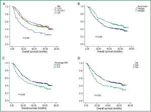 With a median follow up time of 30 months, the median OS for the entire patient group was 37.3 months with the 5-year OS rate of 43.0%. The median OS for patients with BMI less than 18.5, patients with BMI within 18.5-24.9 and patients with BMI more than 24.9 were 19.2, 43.2 and 51.6 months, respectively, with the 5-year OS rates of 25.2%, 46.1% and 48.1%. (P<0.001) (Figure 1A). Percentage of IBW, PNI, Broca Index and weight loss were also significantly associated with OS (P<0.01 for all) (Table 2, Figure 1B-D).
