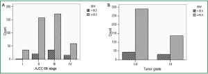 As BMI was an independent prognostic factor for ESCC patients, we further explored its correlation with clinicopathological characteristics of the entire cohort. As summarized in Table 4, patients with BMI <18.5 tended to present with a more advanced stage disease and a poorer differentiation grade, with P values close to 0.05 (Figure 2A,B). However, there were no differences across BMI groups (underweight or not) with respect to all the clinicopathological variables analyzed (P>0.05 across all groups).