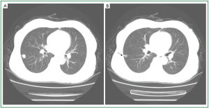 A 64-year-old female nonsmoker was admitted to our hospital because of chest pain without cough, hemoptysis, and other systemic symptoms. A chest CT scan revealed a peripheral solid nodule with a diameter of 13 mm in the lower lobe of the right lung (Figure 1A). The lesion did not present lobulated sign or spiculated sign, however, focal pleural indentation was observed (Figure 1B). From the CT scan, the diagnosis of lung cancer could not be excluded. Following wedge resection was performed. On gross examination, the tumor itself varied from grey to pale yellow. Microscopically, squamous and glandular epithelium could be observed, and in some area transitional epithelium like urothelium with morphology between the two kinds of epithelium was also present. Including transitional epithelium, all kinds of epithelium displayed papillary growth architectures (Figure 2A-C). The glandular epithelium consisted of non-ciliated columnar cells with eosinophilic cytoplasm and some mucin-filled cells (Figure 2B). In addition, the different epithelium showed no significant atypia, while some glandular tumor cells extended into adjacent bronchiolar and alveolar spaces with mucus which is similar to adenocarcinoma with lepidic-like pattern (Figure 2B). Further Immunohistochemical analysis showed these different components were diffusely positive for cytokeratin (CK) 7 (Figure 3A), CK19, CAM5.2, CK5/6 (the staining of the mucous cells were weak) (Figure 3B), and CK34βE12, but negative for CK20 or p16. The p63 staining showed immunoreactivity in the basal layer of glandular epithelium, and mostly in basal and parabasal layers of squamous and transitional epithelium. The different components were also positive for TTF-1, and in the squamous component, cells in the upper layers had weaker staining compared with that in the basal and parabasal layers (Figure 3C). The present case has been followed up for 24 months with no recurrence.