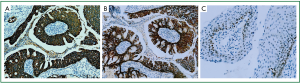 Interestingly, the immunohistochemical analysis showed these different kinds of epithelia had similar immunophenotype. Our findings were similar to that of Inamura et al. reported (7): all kinds of epithelia were diffusely positive for CK7, CK19, CAM5.2, CK5/6 (the staining of the mucous cells were weak) and CK34βE12, but negative for CK20. All kinds of epithelia were positive for TTF-1, which was strongly immunostained in the basal cells of squamous component, while became weaker as the maturity of squamous epithelium, and finally disappeared in the surface layer of the squamous epithelium. In consideration of aboving histological and immunohistochemical findings, we consider the tumor’s different components arise from the same kind of progenitor cells which can differentiate into different components, including glandular, squamous and urothelium-like epitheliums.