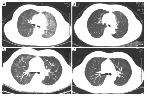 A 46-years old male was admitted to our hospital for a mass on left jaw. After operation, pathological examination revealed a diffuse large-B cell lymphoma in salivary gland. Immuno-labeling showed that CD20, CD79alpha, CD21, Ki-67, and bcl-2, 6 were all positive. The patient was wholly accessed and diagnosed as diffuse large-B-cell lymphoma, stage II A, IPI score 0, and given R-CHOP regimen (Rituximab 0.6, day 1, CTX 1.2, day 1, doxorubicin 100 mg, VCR 2 mg day 1, prednisone 100 mg, day 1-5). The patient well tolerated the chemotherapy and discharged on Dec 31st, 2011. The chemotherapy was repeated biweekly for 5 cycles. In March, 2012, he presented with cough, slight chest-tightness, and a fever of 37.5 degrees centigrade. He was admitted to hospital on April 2nd, 2012. Physical examination did not find any abnormal signs of the lung like rale. Peripheral blood cell count was normal (WBC 8.1×109/L, Neutrophilecyte 64%). A chest CT scanning was performed and showed ground glass opacities and enhanced pulmonary infiltrates in right upper lobe of the lung which suggested lung infection (Figure 1C). He was given levofloxacin and cefoperaxone. However the symptoms were not satisfactorily relieved. For the relatively typical manifestations on CT scanning film, special pathogens were suspected and a diagnostic bronchial alveolar lavage was maneuvered. Smear of BAL fluid revealed foamy masses highly suggestive of Pneumocystis jiroveci and Giamsa-staining was further performed. PCP was confirmed by typical morphological features of Pneumocystis jiroveci under microscope and the diagnosis was finally established. Due to a history of allergic to sulfa drugs, he was given Caspofungin (50 mg daily with 70 mg at day 1) instead of TMP-SMZ beginning on April 7th. The symptoms were relieved remarkably within a week. A Chest CT scanning was performed on April 12th, and demonstrated that most of the patches were absorbed and the pulmonary infiltrations were reduced (Figure 1D). For the satisfactory result of anti-Pneumocystis jiroveci treatment and no contradiction of chemotherapy, the patient accepted further R-CHOP chemotherapies. The patient was given 7 cycles of R-CHOP regimen all together. PCP was not found during the later chemotherapies.