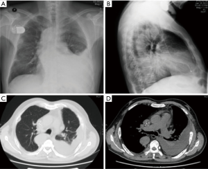 A 72-year-old man presented for chest pain and dyspnea for four months. He felt paroxysmal chest pain, which was aggravated with severe cough. He had exertion associated dyspnea for one month. His medical history included atrial fibrillation, sick sinus syndrome, and implantation of artificial permanent pacemaker. Physical examination revealed the dullness to percussion and the obvious decrease in audible breath sounds in left lower chest wall.