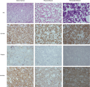 The pleural effusion increased rapidly and it was urgent to clarify the reason of pleural effusion. The smear of pleural effusion showed no evidence of malignancy after repeated cytology smear. To capture the possible cancer cells in pleural effusion, pleural effusions were centrifuged and the sedimentation was embedded with wax to make cell block for immunocytochemistry. It was exciting and amazing to discover the myelomatous cells expressing CD138 (++) and λ (++) in pleural effusion (Figure 3). Moreover, protein electrophoresis of pleural effusion showed M protein and immunofixation electrophoresis demonstrated the existence of monoclonal λ band. And the concentration of λ in pleural effusion was high, similar to that in serum. Flow cytometry confirmed the existence of myelomatous cells in pleural effusion which were the same as those in bone marrow.