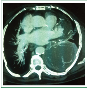 An 81-year-old woman was admitted to hospital for investigations after complaining of left chest pain. She and her family had no specific history and she was no smoker. Patient presented with a chest pain. The chest roentgenogram revealed a nodular shadow within the left lung. A subsequent chest computed tomography (CT) showed a 10 cm × 9 cm, well-circumscribed, intrapulmonary nodular lesion with a large basal pleural connection in the postero-basal and lateral-basal wall of left lung (Figure 1).