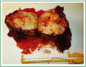 The resected tumor was well circumscribed and its dimension was 10 cm × 9 cm (Figure 2). This was surely a peculiar great size for this tumor according with literature.