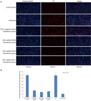 The current research was approved by the Ethics Committee of the First Affiliated Hospital of Nanjing Medical University (No. 2009-SR-033.1). The ventricular tissue was minced then moved to 10 mL of 0.1% collagenase solution to digest the cardiac muscle tissue. After 8 min of digestion on the shaking table at 37 °C repeating for three times, the solution was centrifuged for 10 minutes at 1,000 rpm at 4 °C. After removing the supernatant, the collected cells were resuspended in 8 mL DMEM supplemented with 10% fetal bovine serum (FBS) and inoculated in a 10-cm diameter culture dish. After incubating the cells at 37 °C under 5% CO2 flow for 90 minutes, dishes were aspirated and cells transferred to 96-well or 6-well plates at a density of 1×105 cells/mL. After 72 hours, cardiomyocytes were randomly divided into six groups: normal control group, H/R group, H/R group + negative control transfection group, H/R + siRNA-67809 transfection group, H/R + siRNA-67810 transfection group, and H/R + siRNA-67811 transfection group.