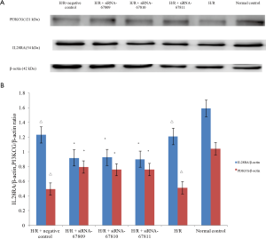 Although H/R and H/R + negative control groups had increased expression of IL28RA and decreased expression PI3KCG relative to the transfection group, both groups had decreased IL28RA and PI3KCG when compared to the normal control group (Figure 3A). This suggests that siRNA works by inhibiting IL28RA while promoting PI3KCG.