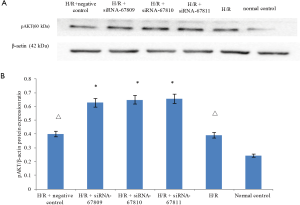 Then, we observed the pAKT/β-actin protein expressions ratio in Figure 4. The H/R and H/R + negative control groups had increased pAKT/β-actin ratios relative to controls (0.390±0.002, 0.399±0.003, respectively, P<0.05; compared to control: 0.243±0.006). The siRNA transfection group had a significantly higher pAKT/β-actin ratio when compared to that of the H/R and H/R + negative transfection groups (0.627±0.004, 0.648±0.003, 0.656±0.005, respectively, P<0.05) which suggested that the siRNAs promote the AKT phosphorylation and active the PI3K/AKT signal pathway (Figure 4A,B).