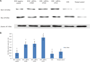 As we see in Figure 5B, the Bcl-2/Bax ratio decreased in H/R and H/R + negative controls compared to the control group (0.331±0.005, 0.392±0.003, respectively, P<0.05, compared to normal control: 0.486±0.006). Compared with H/R and H/R + negative transfection groups, the three siRNA transfection groups expressed a higher Bcl-2/Bax ratio (1.009±0.004, 1.055±0.003, 1.514±0.005, respectively, P<0.05).