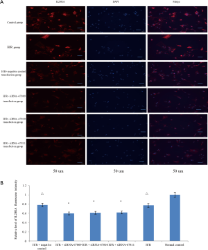 To test whether inhibiting IL28RA could protect cardiomyocytes from H/R injury, we transfected cardiomyocytes with three pairs of siRNA (siRNA-67809, siRNA-67810 and siRNA-67811) all designed to interfere with lncRNA260, a key regulator for the IL28RA gene. RNA interference (RNAi) is a common biological phenomenon, where siRNA binding with its complementary messenger RNA (mRNA) results in the degradation of the mRNA molecule, thus inhibiting its translation. RNAi-mediated gene expression is easier than conventional gene knockouts approaches and also possesses a high specificity and efficiency compared with antisense oligonucleotides, RNA enzymes, and DNA enzymes (13-16).