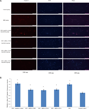 As Figure 7A has shown that the cleaved caspase 3 is localized in the nucleus. The cleaved caspase 3 fluorescence intensity is significantly increased in the H/R group and H/R + negative control group, compared with the normal control group (1.60±0.08, 1.65±0.075, respectively, P<0.05; compared to control: 1.00). After the three siRNAs were transfected into the cardiomyocytes, the cleaved caspase 3 fluorescence intensity is decreased which suggested that the lncRNA 260 siRNAs inhibit the cleaved caspase 3 expression (1.22±0.025, 1.19±0.030, 1.23±0.028, respectively, P<0.05). The relative value of cleaved caspase 3 fluorescence intensity was shown in Figure 7B.
