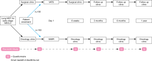 The proposed research is a prospective, observational study in cohort of 300 consecutive patients undergoing treatments for early stage NSCLC in Leeds Teaching Hospital Trust. A prospective study involves a group of similar individuals (in this case, patients treated with surgery and radiotherapy) and following them up over time (longitudinal). This will establish how different factors affect a certain outcome (in this case, HRQOL) and how that outcome may change over time. Patients will be invited to self-report symptoms, functions and HRQOL using the online secure QTool software at home or clinic (Figure 1). Paper administration will be offered to patients without Internet access.
