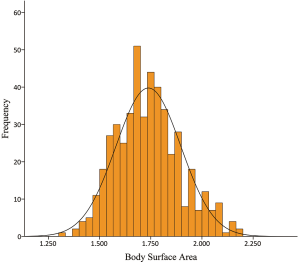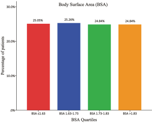 A frequency distribution histogram of BSA is shown in Figure 1. Besides, the patient percentages distributed in BSA quartiles are shown in Figure 2. We thus got a median BSA value of 1.73 m2 in our cohort for further grouping and comparisons.