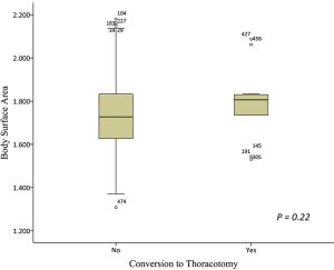 Thirteen patients in the “large” group converted to thoracotomy, while another three converted patients belong to the “non-large” group. The “large” patients had a significantly higher conversion rate than the “non-large” patients (P=0.010; Table 1). However, these was no significant difference in the mean BSA between converted patients and completely VATS patients (1.79±0.16 vs. 1.74±0.16 m2; P=0.22; Table 3; Figure 3).