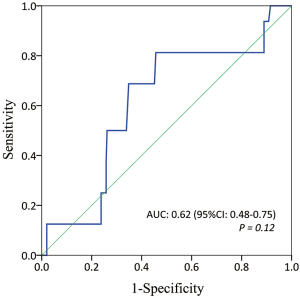 The ROC analysis showed an AUC of 0.62 (95% CI: 0.48–0.75; P=0.12) for BSA to predict conversion to thoracotomy (Figure 4). On the basis of ROC curve, we found that the median BSA of the entire cohort (1.73 m2) was exactly the optimal cut-off value, with the maximum joint sensitivity of 81.3% and specificity of 54.3%, for the prediction of conversion to thoracotomy.
