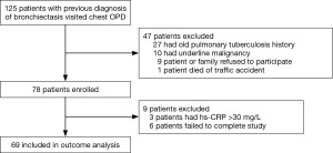 Patients with non-CF bronchiectasis were enrolled from our outpatient clinic in 2006 to investigate the correlation between clinical outcome and clinical surveillances, including several spirometry biomarkers, HRCT, and 6MWT. Initially, 125 patients with bronchiectasis were recruited from the Thoracic Outpatient Clinic of Chang Gung Memorial Hospital in Taiwan from January 2006 to December 2007. Our inclusion criteria were as follows: bronchiectasis documented on chest HRCT, idiopathic etiology of bronchiectasis (none of the patients with background suggests cystic fibrosis such as chronic dysfunction of the pancreas or liver or intestine, or an electrolyte imbalance, disease onset before adolescence and family history), chronic sputum production (daily sputum ≥10 mL), absence of other major pulmonary diagnoses, and a steady state defined by the absence of changes in symptoms noted by the patient over the past 3 weeks. The exclusion criteria were as follows: bronchiectasis with defined etiology (i.e., primary ciliary dyskinesia, allergic bronchopulmonary aspergillosis), common variable immunodeficiency, and use of antibiotics within the last three weeks. Patients with hepatic failure, malignancy, or pregnancy were also excluded (Figure 1). The Linko Chang Gung Memorial Hospital is a tertiary care medical center in north Taiwan. The following-up visit interval is 3 or 6 months at our out-patient clinic. Six years after recruitment, these patients were reassessed and factors identified in the original assessments were reanalyzed to determine the usefulness of these parameters to predict survival. There is no single method to predict the clinical outcomes of patients with non-CF bronchiectasis. The aim of the present study was to investigate whether 6MWT-derived variables predicted outcomes, with a particular focus on DSP during 6MWT.
