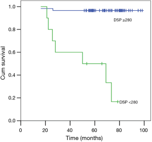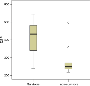 Table 1 shows the baseline demographic characteristics of the study participants and 6MWT-derived variables. There was no significant difference in age or sex distribution between the groups of survivors and non-survivors. There were also no significant differences in serum IgE levels, ECP, and the presence of bacterial colonization between the two groups. The survivor group had higher FVC (2.1±0.7 vs. 1.3±0.5 L, P=0.003), FEV1 (1.6±0.7 vs. 0.8±0.4 L, P=0.002), and FEV1/FVC (72.1%±11.4% vs. 63.1%±11.6%, P=0.030). Oxygen saturation during exercise was lower in the non-survivors than the survivors (79.7%±9.6% vs. 87.9%±6.5%, P=0.001), and there was also a significant difference in EID (O2 <88%) between the two groups [seven of nine patients (78%) vs. 22 of 60 patients (27%), P=0.003]. 6MWD was significantly longer in the survivors (466.1±78.0 vs. 359.4±113.6 m, P=0.001). DSP was significantly correlated with outcomes, reflecting the cumulative contribution of component parts (Table 1). The mean DSP was only 283.9±90.0 m% among the non-survivors compared to 410.5±78.9 m% among the survivors (P<0.000). The distribution of DSP among the cohort is shown in Figure 2.