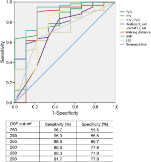 As shown by the univariate survival analysis results presented in Table 1, FVC, FEV1, FEV1/FVC, EID (saturation O2% <88%), lowest oxygen saturation during 6MWT, 6MWD, and DSP were significant prognostic factors for survival (with associated P<0.05).