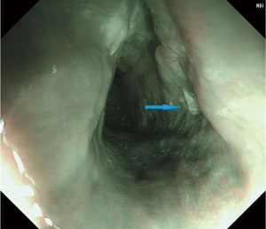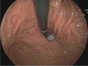 The chest tube was removed on the 4th postoperative day. We performed a barium swallow of the upper digestive tract on the 7th postoperative day to examine the recovery of gastrointestinal function after surgery and it suggested satisfactory digestive system recovery (Figure 6). The postoperative course was uneventful, and the patient was discharged on the 10th postoperative day. The patient was seen at one-month follow-up and found to be doing well with no complaints. An endoscopy showed no evidence of anastomotic leakage and esophageal narrowing (Figure 7). Dysphagia, and retrosternal discomfort had completely relieved and he was able to have regular diet without nausea and vomiting. He was instructed to follow up in 1-year time.