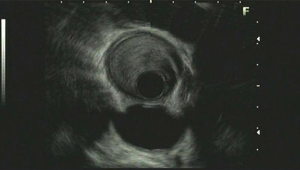 Upper gastrointestinal tract endoscopy disclosed a giant submucosal mass with a smooth surface that was located 18 to 40 cm from the incisors. Multiple biopsy specimens revealed inflamed mucosa with hyperaemia. There was no evidence of malignancy. Ultrasonic gastroscopy disclosed a giant protrusion of the esophagus located 18 cm from the incisors that originated from the submucous and was suspected to be a neurofibroma because of its homogeneous and hypoechoic lesion with clear margins. Distal esophagus and gastroesophageal junction was normal (Figures 1,2). A barium swallow showed a large intraluminal mass of the upper esophagus and compensatory dilatation of the proximal esophagus. A slightly irregular mucosal surface indicated a probable benign esophageal tumor (Figure 3). The patient underwent cervical, cardiac and abdominal ultrasound, which were unremarkable. Blood counts, biochemistry values and tumor markers levels were all found to be within normal limits.