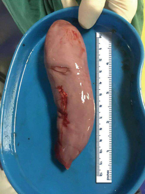 Esophageal lesions greater than 10 cm in diameter are generally classified as giant tumor (14). Giant esophageal tumor was classically treated by open thoracotomy, either a right thoracotomy for tumors of the upper and middle third of the esophagus, or a left thoracotomy or transhiatal approach via laparotomy for lower third and esophagogastric junction (15). Although the minimally invasive surgery has developed rapidly, the indications of thoracoscopic approach still remain controversial, which depends on the size and location of the lesion and experience of the surgeon (16). In the case presented, the pedicle of the giant tumor was located in the upper thoracic esophagus. Besides, the patient had a long history of smoking and hypertension, his pulmonary and cardiac function was not optimistic. After comprehensive evaluation, a right posterolateral thoracotomy was considered as the most appropriate approach performed to remove the lesion. As the tumor enlarges, it tends to vascularity and displacement of adjacent structures. Consequently, a careful attention should be paid to hemostasis and protect adjacent viscera.