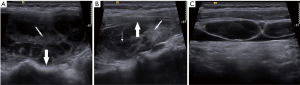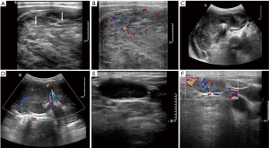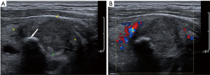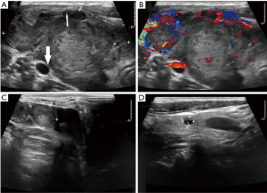 From a retrospective review of the pathologic database at our institute between November 1999 and March 2017, 108 patients with PTL and 48 patients with ATCs were included in the present study. Eighty-one patients with PTL and 33 patients with ATC with incomplete imaging data were excluded. Finally, 27 patients with PTL and 15 patients with ATC were included in this study. Thirty-six patients underwent surgery. We retrospectively reviewed the clinical characteristic and sonographic features of these patients. The study was approved by the Hospital Ethics Committee. Each patient was consent informed.