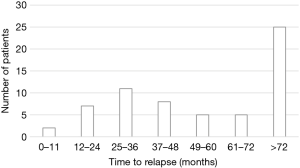 Time to recurrence distribution, shown in Figure 1, indicated two relapse peaks after primary resection, the former between 25 and 36 months and the latter beyond 72 months.