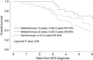Median OS from the date of diagnosis of distant metastasis was 72 months for the whole population. Median OS for metachronous disease with TTR >5 years after primary diagnosis was 78 months, 73 months for metachronous disease with TTR <5 years and 53 months for synchronous disease.